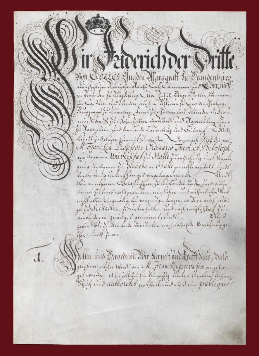 The Francke Foundations are 325 years old. They were founded with the »Chur-Fürstlich-Brandenburgische Privilegium« of 19 September 1698. But what did this document actually say and what does the term »Privilegium« mean?